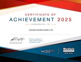 At Adair’s Demolition, safety is our top priority. We are COR Certified through the Saskatchewan Heavy Construction Association. Demolition is a high-risk industry, and we understand the importance of being proactive. Our zero-incident safety plan is designed to identify risks and take the right precautions to prevent accidents before they happen.